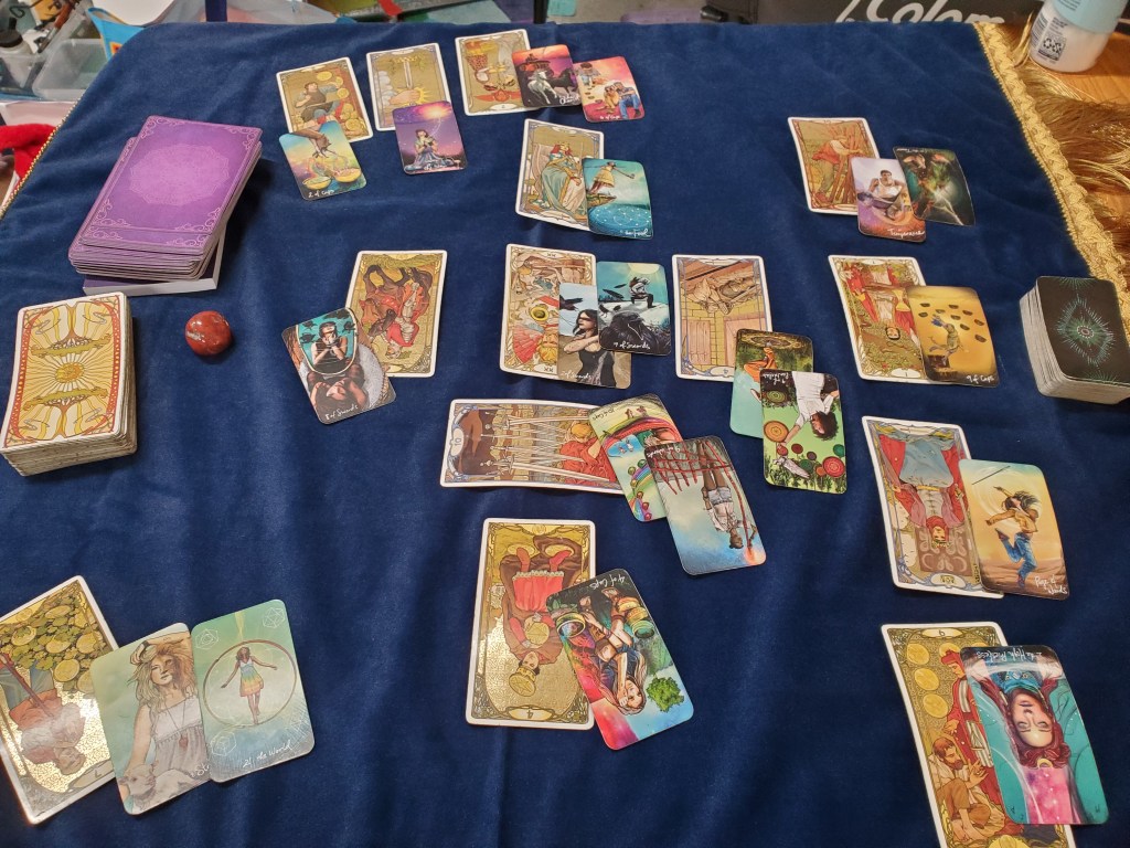 In a 45 min reading, I usually do a Celtic Cross–a spread of 10 cards, 3 more advice cards and an underlying energy card to show us what may be hidden under the questions we’ve asked, or something we aren’t aware of that may be unconscious or subtle influence on the question and the answer that is given.