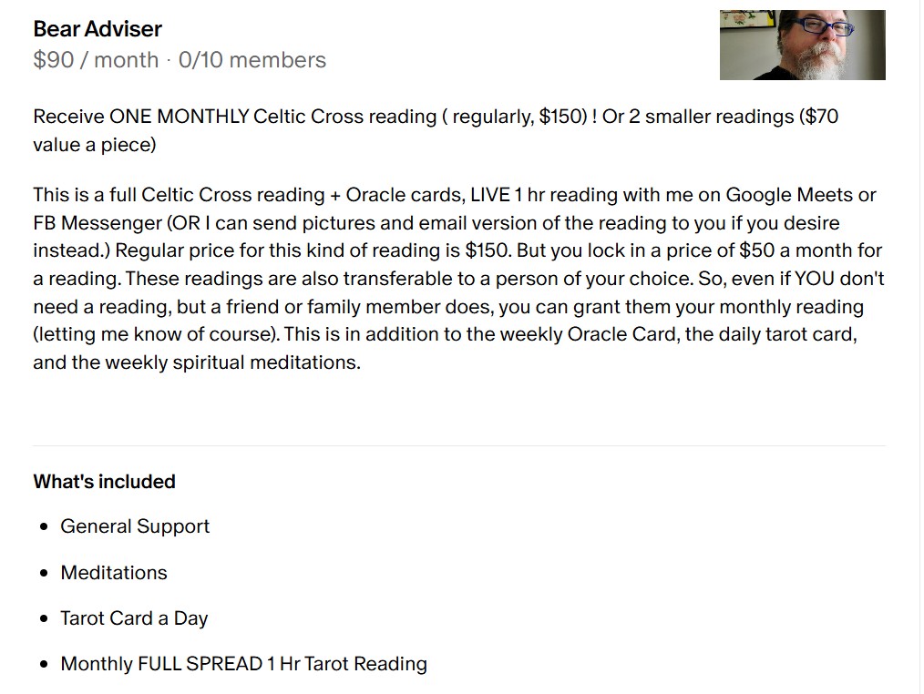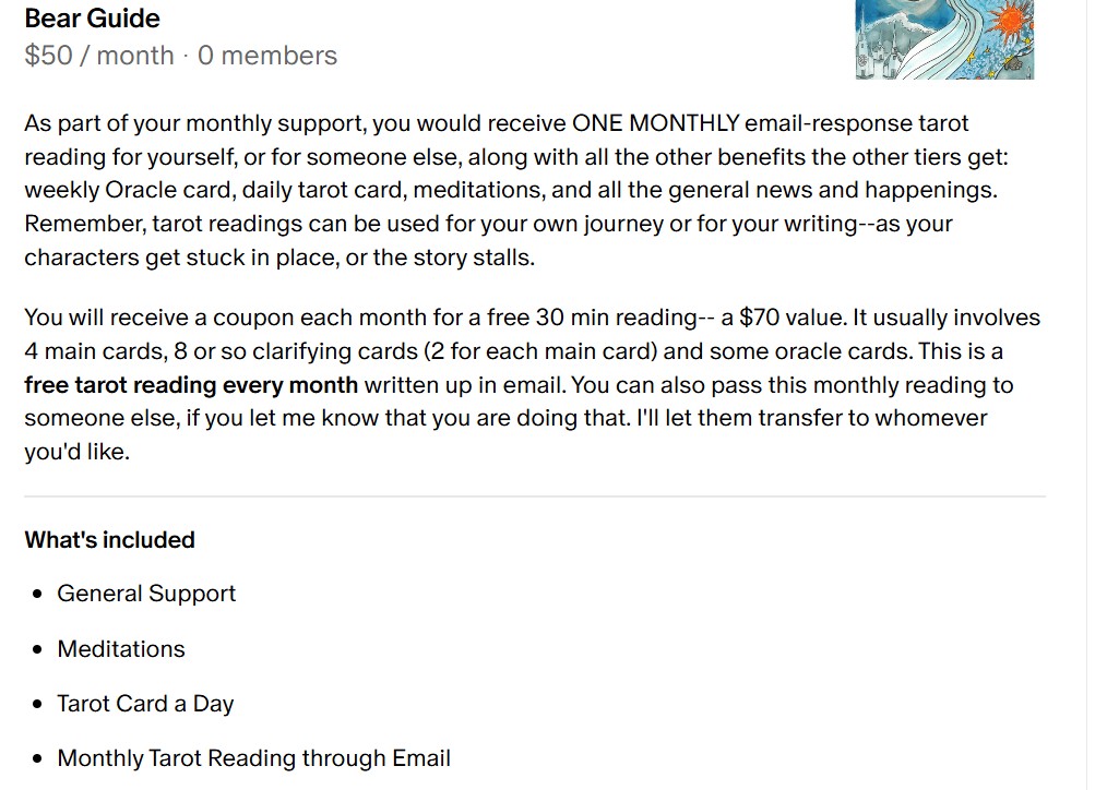 I created a Patreon for those who want to get a tarot card of the day, and a little insight into that card with some clarifiers, as well as other perks—and two of them are the BEAR GUIDE or BEAR ADVISER levels.