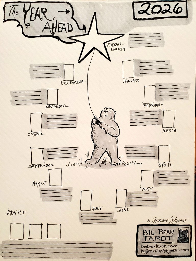 NEW: 2026 Year Ahead reading (see illustration to the left) I do a one-card reading for each of the 12 months of 2026, give you an overall energy and three advice cards. This is a hand-drawn illustration with places for me to write notes, and I color in the star the color you want. — $75